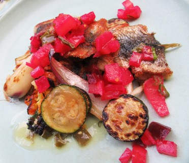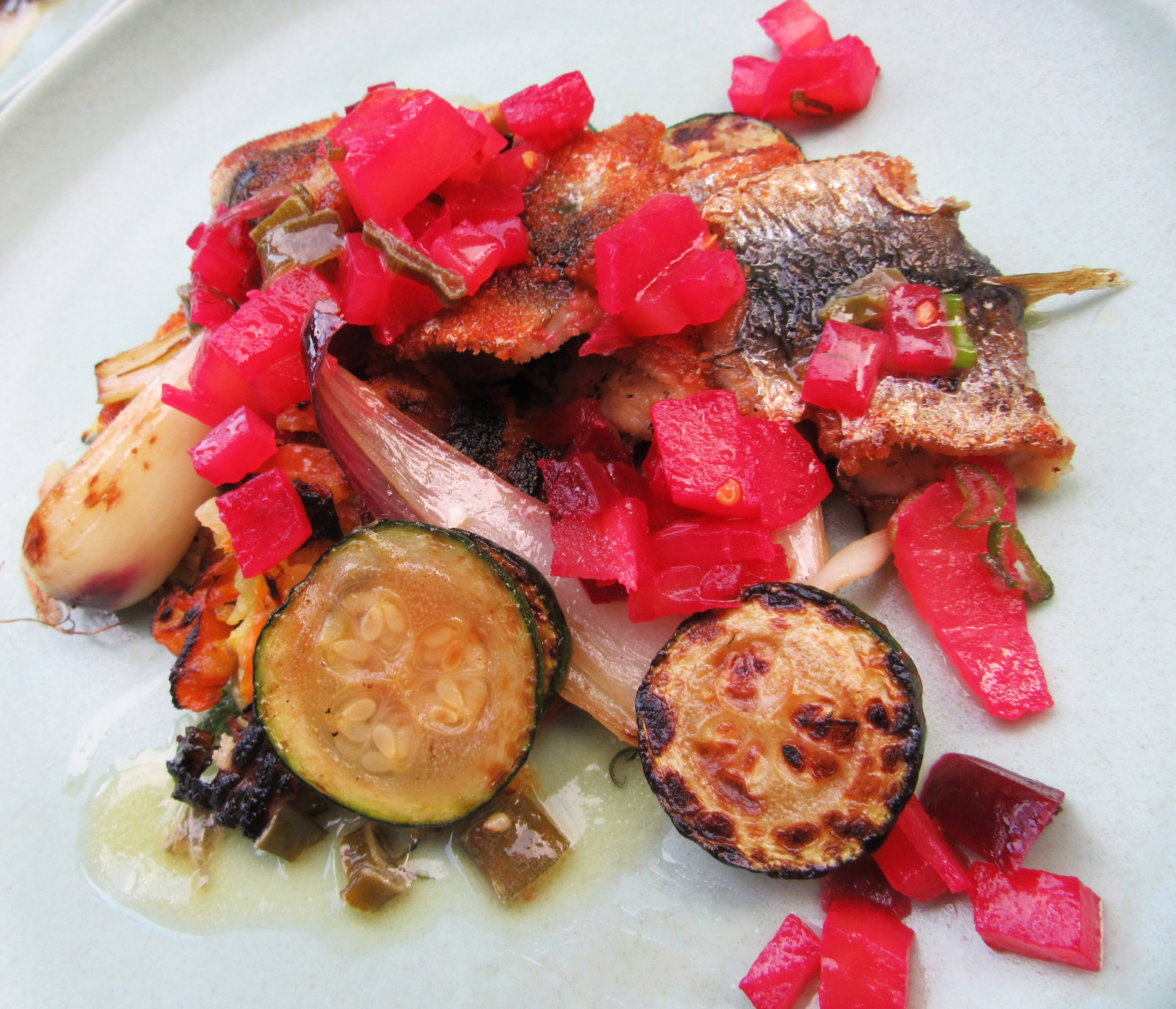 seared herring, with pickled beets, fried carrot, & leek dill butter